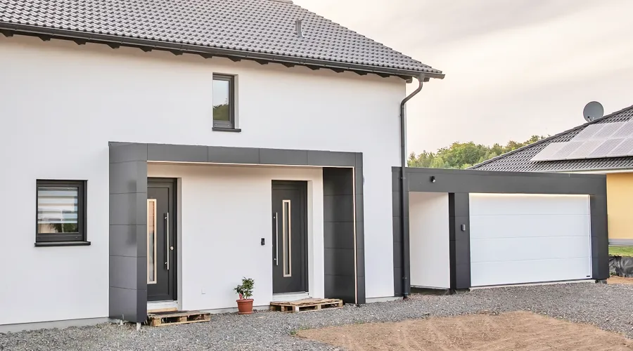 Die Holzrahmenbauweise der Klima+ Garagen erlaubt eine vielseitige Gestaltung. Lassen Sie all Ihre Ideen Wirklichkeit werden: Von der Form der Garage über das Design der Fassade bis hin zur Beleuchtung und der Auswahl von Türen und Fenstern. Damit die Garage optimal zum Erscheinungsbild Ihres Hauses passt, stehen im gleichen Stil auch Haustür-Überdachungen mit hinterlüfteten Fassade, vollständig integrierter Entwässerung in der Seitenwand sowie mit ansprechender Beleuchtung des Eingangsbereichs zur Auswahl.