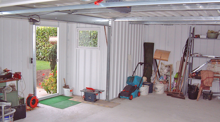 Im Innenbereich sind die Garagen serienmäßig weiß beschichtet, an den Wänden können leicht Halterungen oder Regale für die Aufbewahrung von Fahrrädern oder Gartenwerkzeugen angebracht werden. Zusätzliche Türen sorgen für einen zweiten Ausgang und durch den Einbau von Fenstern gelangt weiteres Tageslicht in die Garage.